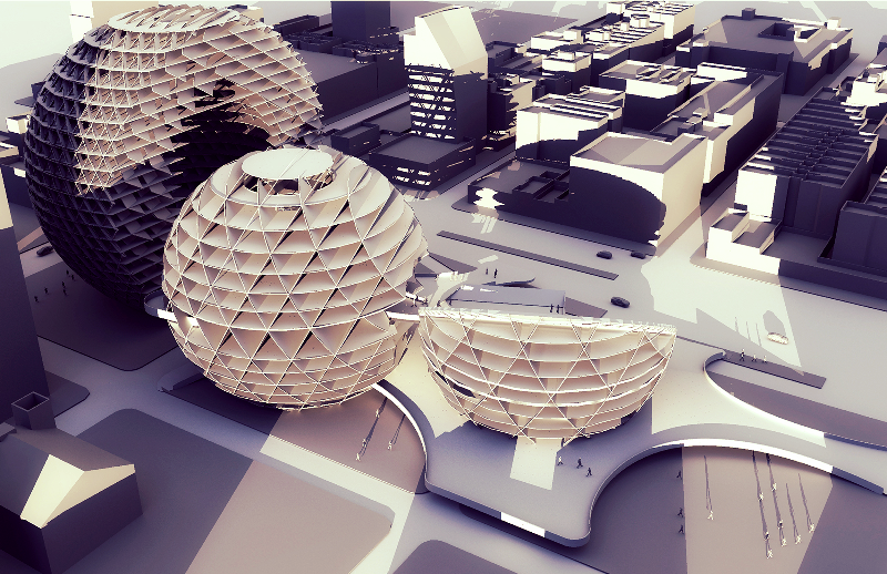 A live-work environment for 1000 artists that explores a particular strain of visionary (And now sometimes realized) urbanism, involving spherical geometries; this project contributes to a wider understanding of the sphere as geometry.